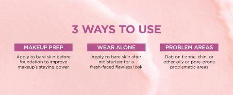 - PRIMER PER IL MAKE UP DEL VISO E DEL CONTORNO OCCHI: Lo applichi sulla pelle pulita o dopo che la crema idratante è stata completamente assorbita. Applichi sul contorno occhi per levigar le linee sottili, sul naso e le guance per minimizzare l’aspetto dei pori e delle imperfezioni e sulla la zona t per opacizzare