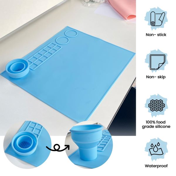 Realizzato in silicone alimentare al 100%, questo tappetino impermeabile, antiaderente e antiscivolo è perfetto per tutte le vostre esigenze di crafting. Con 14 pozzetti e un’area di miscelazione, è perfetto per organizzare i vostri materiali.
