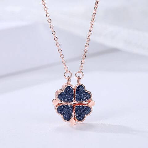 Modello con calamita che consente alla collana di trasformarsi da serie cuoricini in un quadrifoglio.