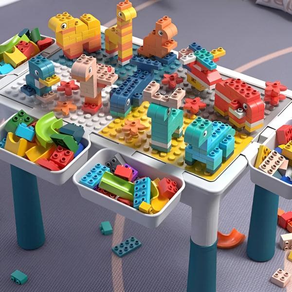 Il tavolo è utilizzabile su entrambi i lati, con un lato progettato per l’assemblaggio dei blocchi e l’altro caratterizzato da una superficie piana.